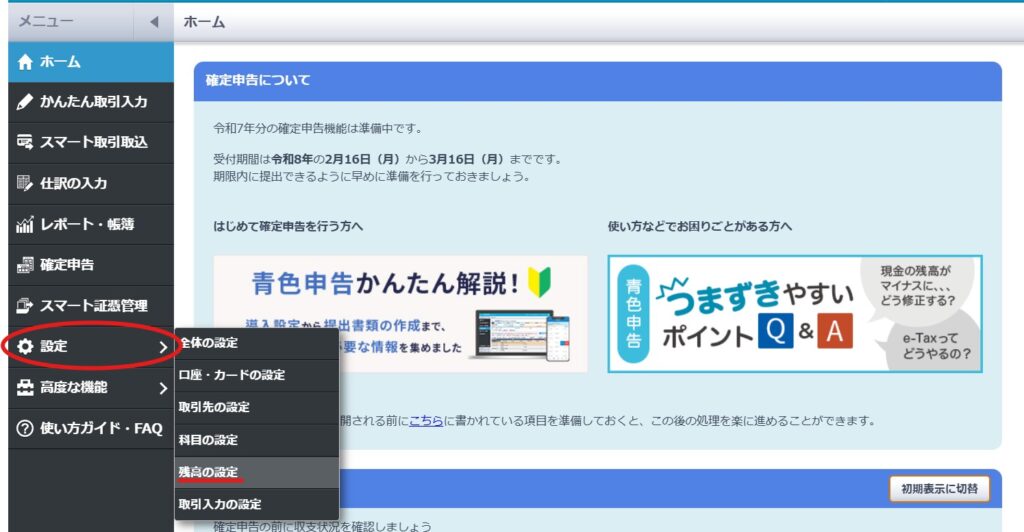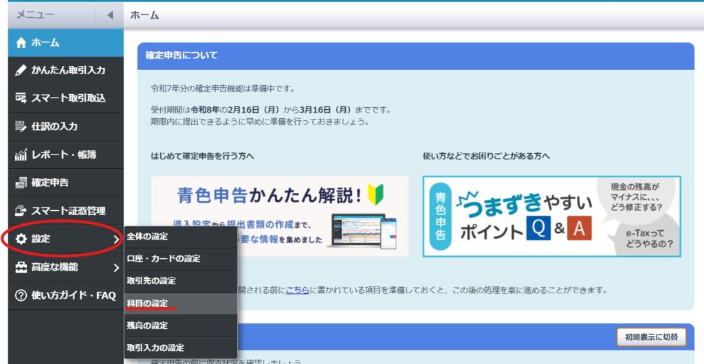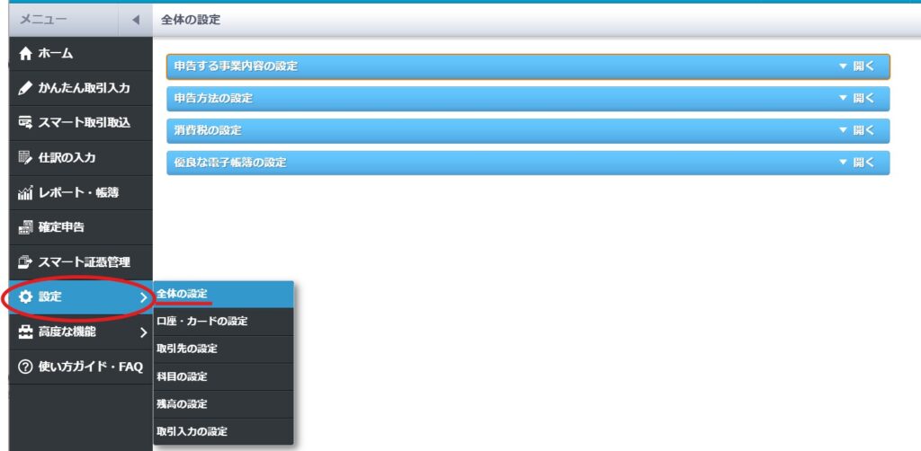 「設定」→「全体の設定」から、青色申告を選択しているか確認します。